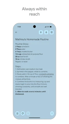 आप जहाँ भी हों, Google Keep आपके साथ है। अपने फ़ोन, टैबलेट, कंप्यूटर और Wear OS डिवाइसों पर निर्बाध रूप से अपने नोट्स एक्सेस करें। आप जो भी नया नोट जोड़ते हैं, वह आपके सभी डिवाइसों पर तुरंत सिंक हो जाता है, जिससे आपकी जानकारी हमेशा आपकी उंगलियों पर रहती है। किराने की दुकान पर पहुँचते ही अपनी खरीदारी सूची देखने की ज़रूरत है? बस स्थान-आधारित रिमाइंडर सेट करें, और Google Keep आपको सही समय पर, सही जगह पर याद दिलाएगा। Google Keep के साथ, आपके विचार हमेशा सही जगह और सही समय पर उपलब्ध होंगे।