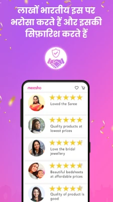 मीशो ऐप से खरीदारी करें या ऑनलाइन कमाई का मौका पाएँ! सबसे कम होलसेल कीमत पर टॉप क्वालिटी के स्टाइलिश लाइफस्टाइल प्रॉडक्ट्स खोजें। बिना निवेश अपना ऑनलाइन बिज़नेस शुरू करें और घर बैठे मीशो के साथ पैसे कमाएँ। रीसेलिंग से आय बढ़ाएँ!
