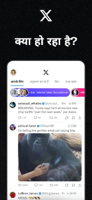 चाहे आप गहन बातचीत पसंद करते हों या मनोरंजक स्ट्रीम, X आपके लिए Spaces के माध्यम से लाइव ऑडियो परिचर्चाओं में भाग लेने या सहजता से लाइव वीडियो स्ट्रीम करने का अवसर प्रदान करता है। व्यक्तिगत कनेक्शन के लिए, आप सीधे संदेशों के माध्यम से निजी बातचीत कर सकते हैं, दोस्तों, परिवार या सहकर्मियों के साथ व्यक्तिगत रूप से जुड़ सकते हैं। अपनी रचनात्मकता को विस्तृत करें और 3 घंटे तक के वीडियो अपलोड करके साझा करें, या निबंध और ब्लॉग जैसे विस्तृत लेखों के माध्यम से अपने विचारों को व्यक्त करें। स्पोर्ट्स से लेकर संगीत और प्रौद्योगिकी तक, अपनी रुचियों के आधार पर समुदाय बनाएं और समान विचारधारा वाले व्यक्तियों से जुड़ें।